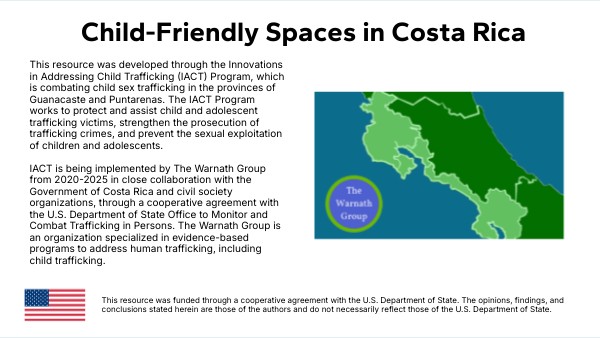 This resource was developed through the Innovations in Addressing Child Trafficking (IACT) Program, which is combating child sex trafficking in the provinces of Guanacaste and Puntarenas. The IACT Program works to protect and assist child and adolescent trafficking victims, strengthen the prosecution of trafficking crimes, and prevent the sexual exploitation of children and adolescents. IACT is being implemented by The Warnath Group from 2020-2025 in close collaboration with the Government of Costa Rica and civil society organizations, through a cooperative agreement with the U.S. Department of State Office to Monitor and Combat Trafficking in Persons. The Warnath Group is an organization specialized in evidence-based programs to address human trafficking, including child trafficking.
