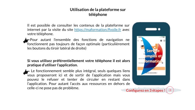 Il est possible de consulter les contenus de la plateforme sur internet par la visite du site https://maformation.ffvoile.fr avec votre téléphone. Pour autant l’ensemble des fonctions de navigation ne fonctionnent pas toujours de façon optimale (particulièrement les boutons du tiroir latéral de droite)