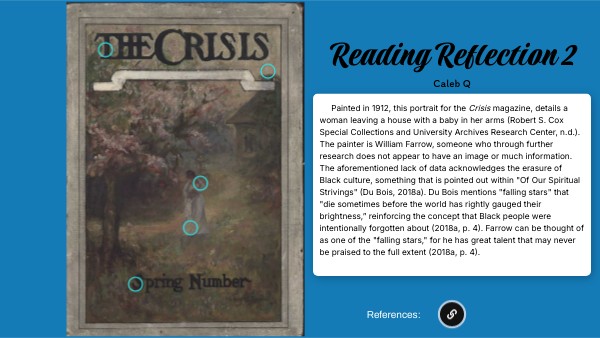 Painted in 1912, this portrait for the Crisis magazine, details a woman leaving a house with a baby in her arms (Robert S. Cox Special Collections and University Archives Research Center, n.d.). The painter is William Farrow, someone who through further research does not appear to have an image or much information. The aforementioned lack of data acknowledges the erasure of Black culture, something that is pointed out within "Of Our Spiritual Strivings" (Du Bois, 2018a). Du Bois mentions "falling stars" that "die sometimes before the world has rightly gauged their brightness,” reinforcing the concept that Black people were intentionally forgotten about (2018a, p. 4). Farrow can be thought of as one of the "falling stars," for he has great talent that may never be praised to the full extent (2018a, p. 4).