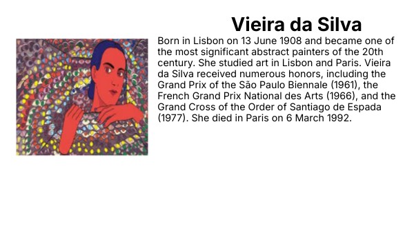 Born in Lisbon on 13 June 1908 and became one of the most significant abstract painters of the 20th century. She studied art in Lisbon and Paris. Vieira da Silva received numerous honors, including the Grand Prix of the São Paulo Biennale (1961), the French Grand Prix National des Arts (1966), and the Grand Cross of the Order of Santiago de Espada (1977). She died in Paris on 6 March 1992.