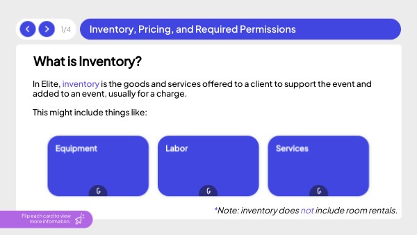 In Elite, inventory is the goods and services offered to a client to support the event and added to an event, usually for a charge. This might include things like: