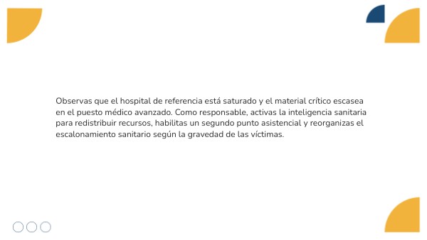 Tras el accidente, coordinas el traslado de víctimas desde el puesto médico avanzado. Detectas demoras en la salida de ambulancias y confusión en las prioridades, por lo que reorganizas la noria de evacuación y estableces comunicación directa con los hospitales receptores.