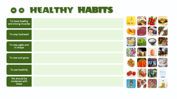 To have a healthy life, we can identify together the habits that we know make us feel good and spread them throughout the week. Let's reflect and complete the table. Drag the images to where you think they belong; some may have more than one possible place, and there could be many other examples. Discuss them with your class if you come up with new ideas.