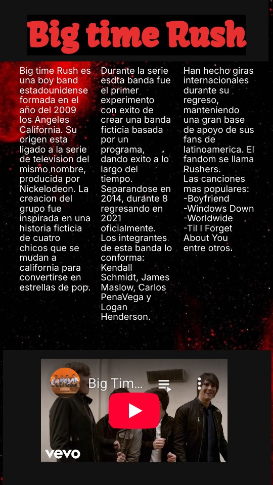 Big time Rush es una boy band estadounidense formada en el año del 2009 los Angeles California. Su origen esta ligado a la serie de television del mismo nombre, producida por Nickelodeon. La creacion del grupo fue inspirada en una historia ficticia de cuatro chicos que se mudan a california para convertirse en estrellas de pop.