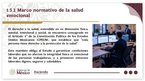 La reforma constitucional en materia de derechos humanos (2011) amplió la interpretación de este derecho, al incorporar el principio pro persona y la obligación de todas las autoridades de promover, respetar, proteger y garantizar los derechos humanos conforme a los tratados internacionales (CPEUM, art. 1º). Esto implica que la salud emocional no puede considerarse un tema accesorio, sino parte integral del derecho a la salud y al trabajo digno, enmarcado en el principio de igualdad sustantiva y no discriminación.