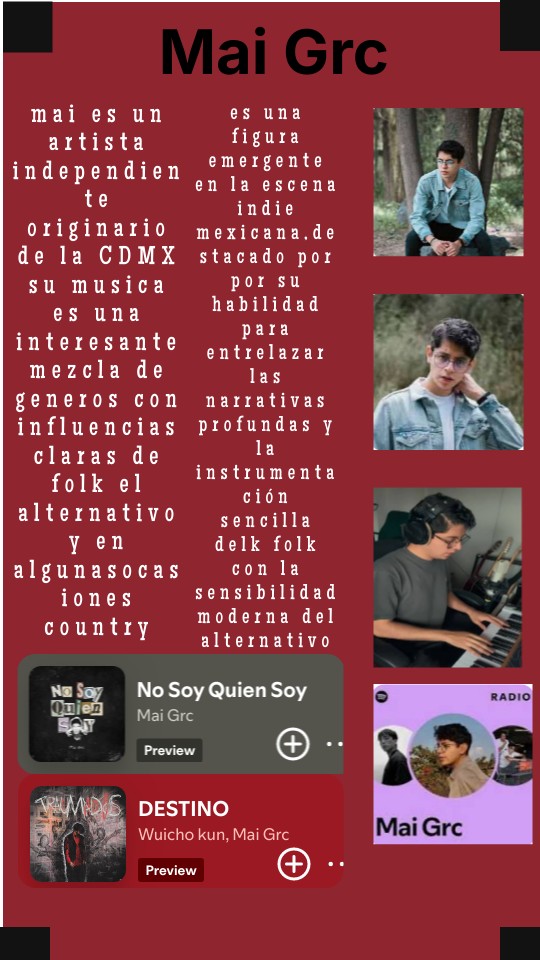 mai es un artista independiente originario de la CDMXsu musica es una interesante mezcla de generos con influencias claras de folk el alternativo y en algunasocasiones country