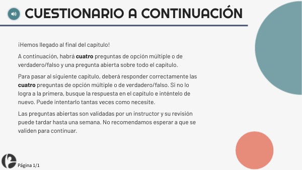 ¡Hemos llegado al final del capítulo! A continuación, habrá cuatro preguntas de opción múltiple o de verdadero/falso y una pregunta abierta sobre todo el capítulo. Para pasar al siguiente capítulo, deberá responder correctamente las cuatro preguntas de opción múltiple o de verdadero/falso. Si no lo logra a la primera, busque la respuesta en el capítulo e inténtelo de nuevo. Puede intentarlo tantas veces como necesite. Las preguntas abiertas son validadas por un instructor y su revisión puede tardar hasta una semana. No recomendamos esperar a que se validen para continuar.