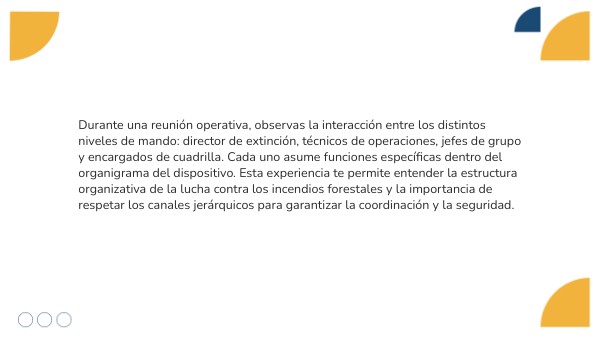 En una de las zonas de trabajo, el viento provoca un cambio brusco en la dirección del fuego y una cuadrilla queda momentáneamente rodeada por humo denso. Activáis el protocolo de seguridad y ordenas su retirada hacia la zona de escape más próxima. Este incidente te hace reflexionar sobre los principales riesgos inherentes al trabajo de extinción y sobre la necesidad de mantener siempre la vigilancia, la comunicación y las medidas preventivas.