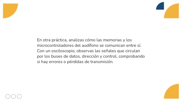 En otra práctica, analizas cómo las memorias y los microcontroladores del audífono se comunican entre sí. Con un osciloscopio, observas las señales que circulan por los buses de datos, dirección y control, comprobando si hay errores o pérdidas de transmisión.