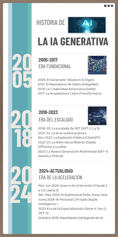 2005: El Generador Aleatorio (CSIgen) 2012: El Repositorio de Datos (ImageNet) 2014: La Creatividad Adversaria (GANs) 2017: La Arquitectura Clave (Transformers)