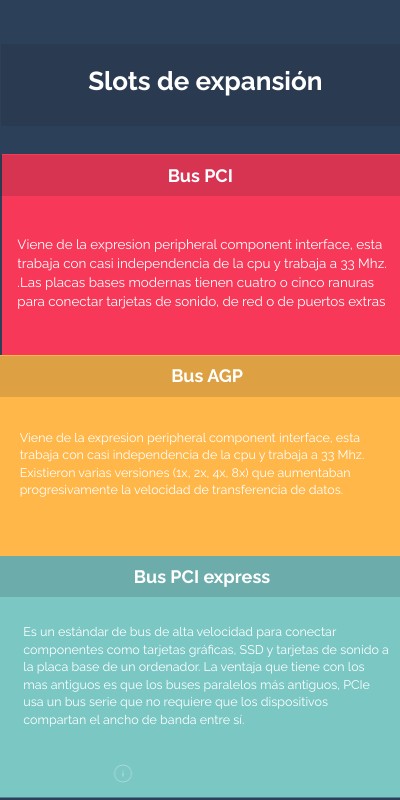 Viene de la expresion peripheral component interface, esta trabaja con casi independencia de la cpu y trabaja a 33 Mhz..Las placas bases modernas tienen cuatro o cinco ranuras para conectar tarjetas de sonido, de red o de puertos extras