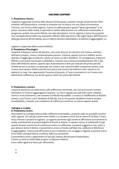 1. Pessimismo StoricoLeopardi, seguendo la teoria delle illusioni di Rousseau, sostiene che gli uomini furono felicisoltanto nell'età primitiva, vivendo in armonia con la natura e in uno stato di innocenza.Tuttavia, con l'arrivo della ragione, l'uomo ha abbandonato questa "beata ignoranza" e hapreso coscienza della realtà, scoprendo la vanità delle illusioni e la sofferenza esistenziale. Ilprogresso, quindi, non porta felicità, ma solo decadenza. Con la ragione, l'uomo ha acquisitouna consapevolezza dolorosa, passando dall'età della speranza e dei sogni (tipica dell'infanzia edella giovinezza) all'età adulta, dove il dolore diventa ineluttabile e la felicità irraggiungibile. La