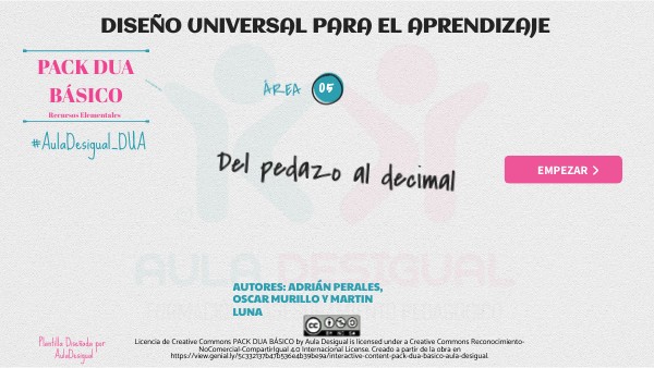 Licencia de Creative Commons PACK DUA BÁSICO by Aula Desigual is licensed under a Creative Commons Reconocimiento-NoComercial-CompartirIgual 4.0 Internacional License. Creado a partir de la obra en https://view.genial.ly/5c332137b47b536e4b39be9a/interactive-content-pack-dua-basico-aula-desigual.