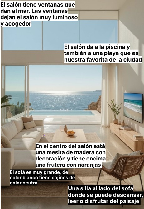 El salón tiene ventanas que dan al mar. Las ventanas dejan el salón muy luminoso y acogedor