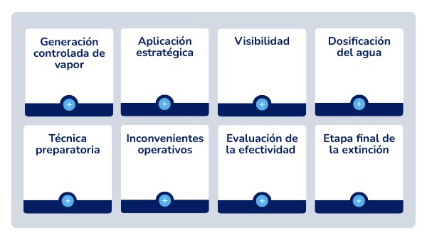 Uno de los aspectos más críticos del método indirecto es el control de la visibilidad. La generación masiva de vapor tiene el potencial de reducir la visibilidad a menos de un metro, lo cual dificulta seriamente la orientación y la coordinación del equipo de intervención. Esta limitación obliga a establecer protocolos específicos de comunicación, implementar sistemas de guiado táctil y definir tiempos máximos de exposición para prevenir la desorientación del personal.