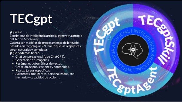 ¿Qué es? Ecosistema de inteligencia artificial generativa propio del Tec de Monterrey. Cuenta con modelos de procesamiento de lenguaje basados en tecnología GPT, por lo que las respuestas serán naturales y completas. ¿Qué podemos hacer?- Chat conversacional (tipo ChatGPT).