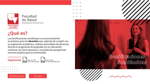 Las bonificaciones constituyen un reconocimiento económico para los docentes que, además de cumplir con su asignación académica, realizan actividades de docencia directa en programas de posgrado y/o en educación continua, así como asesorías y consultorías que generan recursos propios para la Universidad.