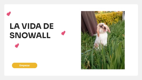 Llego a mi vida un 09 de febrero del 2023, pero el nacio el 09 de enero del mismo año, y se llama Snowball porque cuando llego parecia una bolita de pelos con carita de muñeco de nieve, pero todos le decimos Snowchas o chichi, y es un conejito muy lindo y adorable, aunque un poco travieso, le gustan mucho las golosinas, y salir y estar en el carro cuando van manejando y ver por la ventana, es un pequeño muy entendido y muy listo.