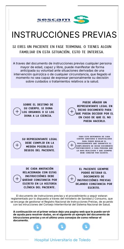 A continuación en el primer enlace dejo una pagina web que le puede servir de ayuda para resolver dudas, en el siguiente un ejemplo del documento de intrucciones previas y en el ultimo unos consejos de como rellenar el documento.