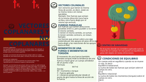 Vectores coplanares:Son aquellos que se encuentran en un mismo plano. Por ejemplo, si dibujas tres vectores sobre una hoja de papel, todos son coplanares porque están en la misma superficie.Ejemplo: Los vectores de las fuerzas que actúan sobre un cuerpo apoyado en una mesa (como peso, normal y fricción) son coplanares.Vectores no coplanares:Son aquellos que no se encuentran en el mismo plano. Para representarlos se necesita el espacio tridimensional.Ejemplo: Las tres fuerzas que actúan sobre un avión en vuelo (empuje, peso y sustentación) son no coplanares.suales para dejar a tu audiencia con la boca abierta. También destacar alguna frase o dato concreto que se quede grabado a fuego en la memoria de tu público e incluso embeber contenido externo que sorprenda: vídeos, fotos, audios... ¡Lo que tú quieras!