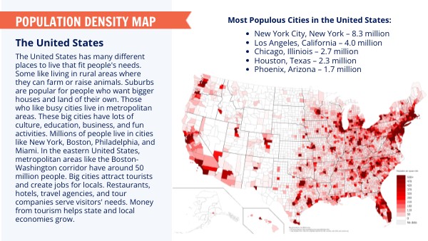 The United States has many different places to live that fit people's needs. Some like living in rural areas where they can farm or raise animals. Suburbs are popular for people who want bigger houses and land of their own. Those who like busy cities live in metropolitan areas. These big cities have lots of culture, education, business, and fun activities. Millions of people live in cities like New York, Boston, Philadelphia, and Miami. In the eastern United States, metropolitan areas like the Boston-Washington corridor have around 50 million people. Big cities attract tourists and create jobs for locals. Restaurants, hotels, travel agencies, and tour companies serve visitors' needs. Money from tourism helps state and local economies grow.