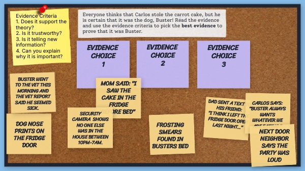Everyone thinks that Carlos stole the carrot cake, but he is certain that it was the dog, Buster! Read the evidence and use the evidence criteria to pick the best evidence to prove that it was Buster.