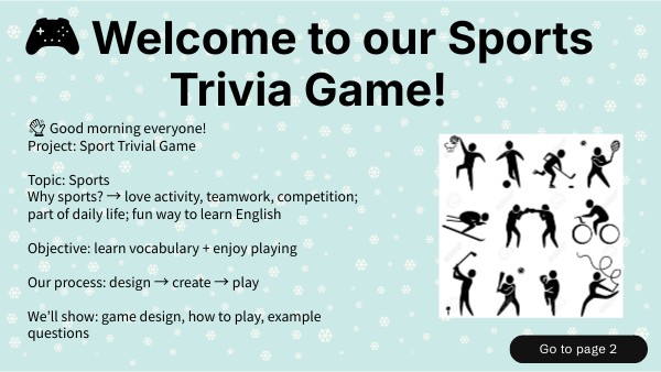 ๐ Good morning everyone!Project: Sport Trivial Game Topic: Sports Why sports? โ love activity, teamwork, competition; part of daily life; fun way to learn English Objective: learn vocabulary + enjoy playing Our process: design โ create โ play Weโll show: game design, how to play, example questions