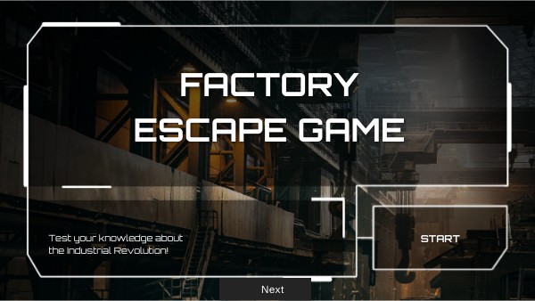 You must explore the different areas of this industrial facility to exit without being discovered. To advance, you must explore each area in the established order by answering key questions about the Industrial Revolution. Only if you overcome each challenge will you be able to access the next point and get closer to completing your mission. Go ahead, the challenge begins now!