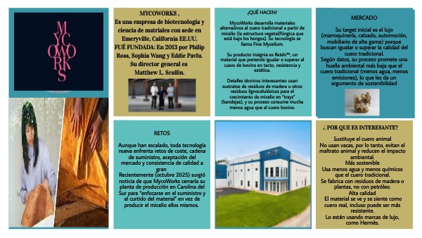 RETOS Aunque han escalado, toda tecnología nueva enfrenta retos de coste, cadena de suministro, aceptación del mercado y consistencia de calidad a gran Recientemente (octubre 2025) surgió noticia de que MycoWorks cerraría su planta de producción en Carolina del Sur para “enfocarse en el suministro y el curtido del material” en vez de producir el micelio ellos mismos.