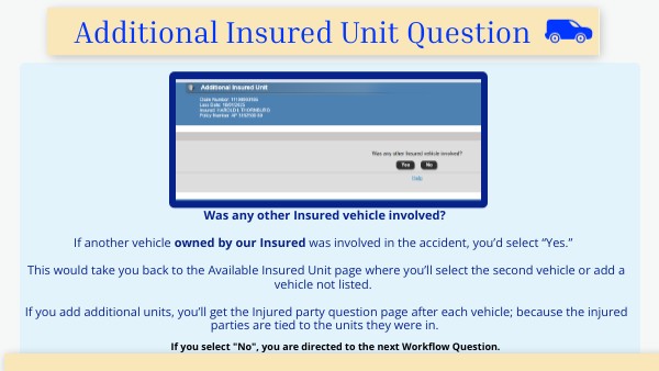 Was any other Insured vehicle involved? If another vehicle owned by our Insured was involved in the accident, you’d select “Yes.” This would take you back to the Available Insured Unit page where you’ll select the second vehicle or add a vehicle not listed. If you add additional units, you’ll get the Injured party question page after each vehicle; because the injured parties are tied to the units they were in.