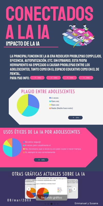 Muchos adolescentes hoy en dia aporvechan que la IA es capaz de resolver todo lo que le pidan. Gracias a esto, los adolescentes estan empezando a usar la IA para que les haga tareas, proyectos, etc, en vez de hacerlo ellos, llevandolos a depender de esta para entregar sus acitivdades escolares. Y esto no termina ahi, sino que tambien se ha visto apps con asistentes IA aprovecharse de esto y seducir a los adolescentes a descargarlos, siendo directos en que los pueden usar para liberarse de sus obligaciones escolares