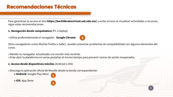 Para garantizar tu acceso al sitio https://bachilleratovirtual.uat.edu.mx/ y evitar errores al visualizar actividades o recursos, sigue estas recomendaciones: 1. Navegación desde computadora (PC o laptop) • Utiliza preferentemente el navegador: Google Chrome Otros navegadores como Mozilla Firefox o Safari, pueden presentar problemas de compatibilidad con algunos elementos del curso. • Mantén tu navegador actualizado a la versión más reciente. • Evita abrir la plataforma en varias pestañas al mismo tiempo para prevenir cierres de sesión inesperados. 2. Acceso desde dispositivos móviles (Android o iOS) • Descarga la aplicación oficial de Moodle desde la tienda correspondiente: o Android: Google Play Store o iOS: App Store