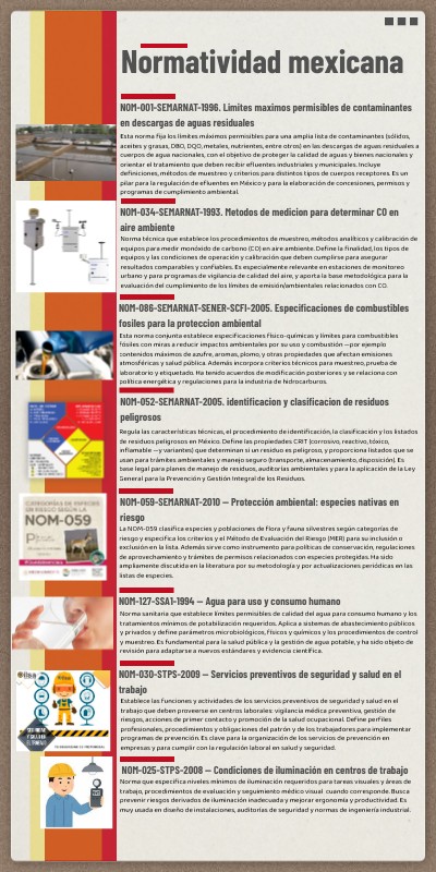 Esta norma fija los límites máximos permisibles para una amplia lista de contaminantes (sólidos, aceites y grasas, DBO, DQO, metales, nutrientes, entre otros) en las descargas de aguas residuales a cuerpos de agua nacionales, con el objetivo de proteger la calidad de aguas y bienes nacionales y orientar el tratamiento que deben recibir efluentes industriales y municipales. Incluye definiciones, métodos de muestreo y criterios para distintos tipos de cuerpos receptores. Es un pilar para la regulación de efluentes en México y para la elaboración de concesiones, permisos y programas de cumplimiento ambiental.
