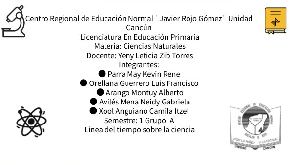 Centro Regional de Educación Normal ¨Javier Rojo Gómez¨ Unidad Cancún Licenciatura En Educación Primaria Materia: Ciencias Naturales Docente: Yeny Leticia Zib Torres Integrantes: ● Parra May Kevin Rene ● Orellana Guerrero Luis Francisco ● Arango Montuy Alberto ● Avilés Mena Neidy Gabriela ● Xool Anguiano Camila Itzel Semestre: 1 Grupo: A Linea del tiempo sobre la ciencia