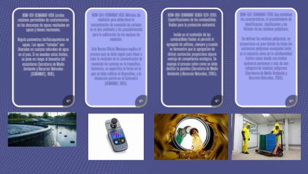 Secretaría de Medio Ambiente y Recursos Naturales. (1996). Norma Oficial Mexicana NOM-001-SEMARNAT-1996. https://www.gob.mx/cms/uploads/attachment/file/110519/NOM_001_SEMARNAT_1996.pdf Secretaría de Medio Ambiente y Recursos Naturales. (1993). Norma Oficial Mexicana NOM-034-ECOL-1993. https://biblioteca.semarnat.gob.mx/janium/Documentos/Ciga/agenda/DOFsr/NOM034.pdf Secretaría de Medio Ambiente y Recursos Naturales. (2004). Norma Oficial Mexicana NOM-086-SEMARNAT-SENER-SCFI-2005. https://www.dof.gob.mx/normasOficiales/892/semarna/semarna.htm Secretaría de Medio Ambiente y Recursos Naturales. (2005). Norma Oficial Mexicana NOM-052-SEMARNAT-2005. https://dof.gob.mx/normasOficiales/1055/SEMARNA/SEMARNA.htm Secretaría de Salud. (2013). Norma Oficial Mexicana NOM-012-SSA3-2012. http://pccn.cucba.udg.mx/sites/default/files/nom-012-ssa3-2012_e_tica_investigacio_n_en_humanos_diario_oficial_de_la_federacio_n.pdf