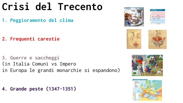 1. Peggioramento del clima 2. Frequenti carestie 3. Guerre e saccheggi (in Italia Comuni vs Impero in Europa le grandi monarchie si espandono) 4. Grande peste (1347-1351)