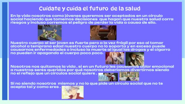 En la vida nosotros como jóvenes queremos ser aceptados en un círculo social haciendo que tomemos decisiones que hagan que nuestra salud corra riesgos y incluso corremos el peligro de perder la vida a causa de ello. Nuestro cuerpo al ser joven es fuerte pero a la vez frágil por eso al tomar alcohol a temprana edad nuestro cuerpo no lo soporta y en exceso puede causarnos enfermedades o incluso la muerte al igual las drogas y el cigarro no pueden ir apagando el cuerpo poco poco. Nosotros nos quitamos la vida , si en un futuro les causamos dolor emocional a nuestros seres queridos por qué nosotros deberíamos divertirnos siendo no el reflejo que un círculos social quiere . Si no siendo nosotros mismos y no lo que pide un círculo social que no te acepta tal y como eres .