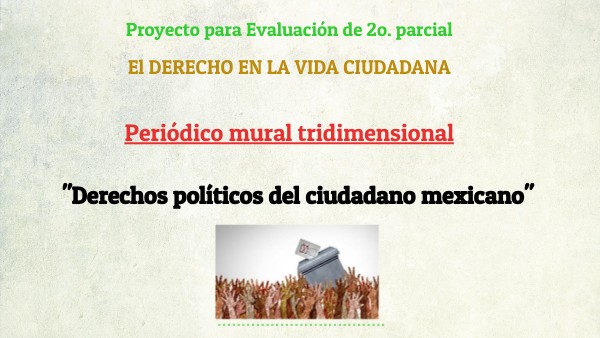 Ejemplos: • En México, el artículo constitucional que aborda los derechos políticos es..., el cual estable que... • Existen mecanismos de participación ciudadana como el Plebiscito, Referéndum y Consulta popular. Cada uno de estos consiste en … • Los jóvenes de 18 años ya pueden votar y ser observadores electorales. • En las elecciones presidenciales de 1988, hubo un importante movimiento social (personas de la sociedad civil y algunos partidos políticos) que argumentaban un fraude. Esta situación fue un parteaguas y sentó las bases para el surgimiento de nuevos partidos y la creación de un instituto electoral autónomo.
