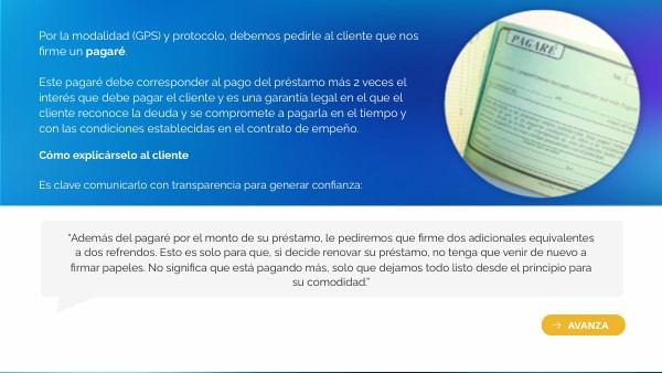 Por la modalidad (GPS) y protocolo, debemos pedirle al cliente que nos firme un pagaré. Este pagaré debe corresponder al pago del préstamo más 2 veces el interés que debe pagar el cliente y es una garantía legal en el que el cliente reconoce la deuda y se compromete a pagarla en el tiempo y con las condiciones establecidas en el contrato de empeño.