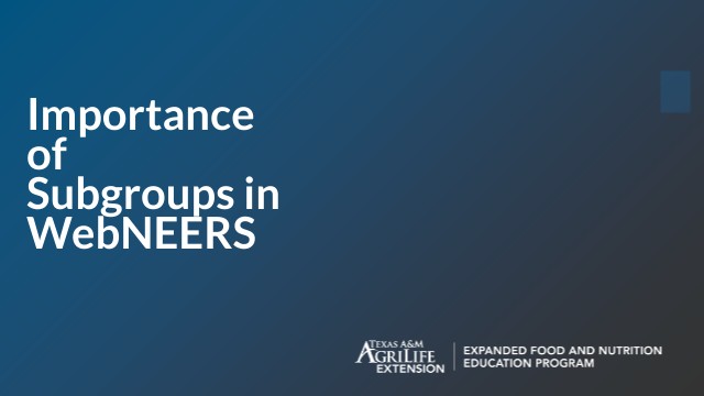 - Subgroups are used to categorize adult participants or youth groups in WebNEERS so data can be generated later to see a groups outcomes, etc.