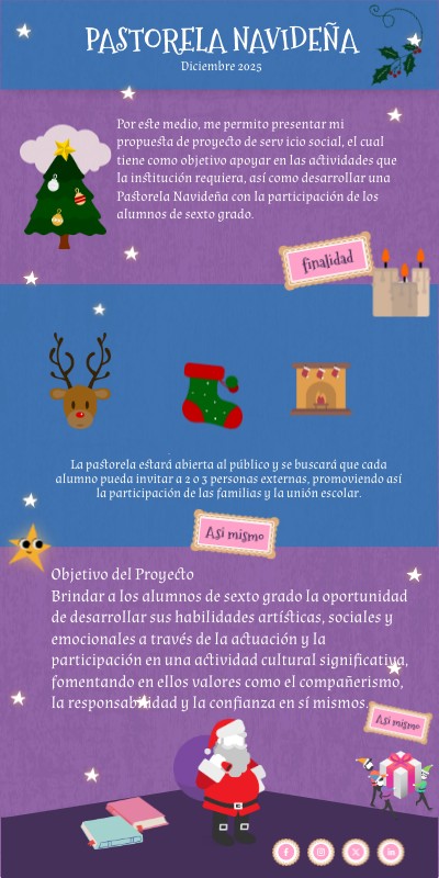 Por este medio, me permito presentar mi propuesta de proyecto de serv icio social, el cual tiene como objetivo apoyar en las actividades que la institución requiera, así como desarrollar una Pastorela Navideña con la participación de los alumnos de sexto grado.