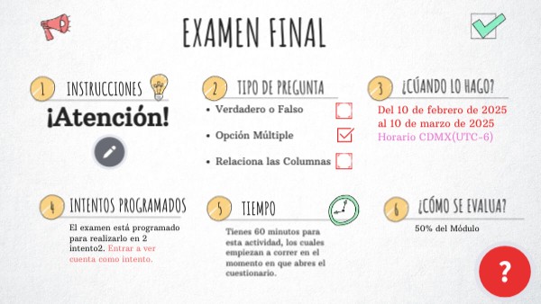 Tienes 60 minutos para esta actividad, los cuales empiezan a correr en el momento en que abres el cuestionario.