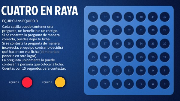 Cada casilla puede contener una pregunta, un beneficio o un castigo. Si se contesta la pregunta de manera correcta, puedes dejar tu ficha. Si se contesta la pregunta de manera incorrecta, el equipo contrario decidirá qué hacer con esa ficha (eliminarla o ponerla en otro lugar). La pregunta unicamente la puede contesar la persona que coloca la ficha. Cuentas con 15 segundos para contestar.