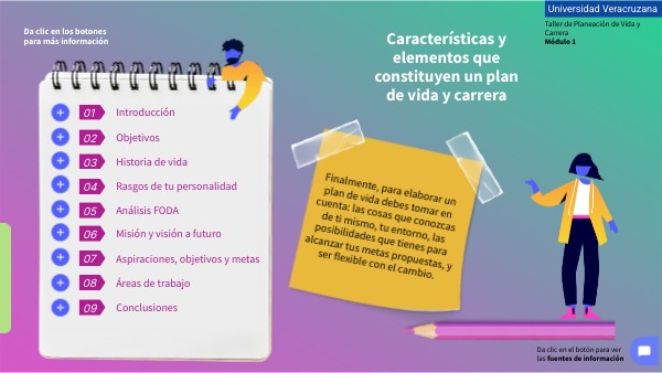 Finalmente, para elaborar un plan de vida debes tomar en cuenta: las cosas que conozcas de ti mismo, tu entorno, las posibilidades que tienes para alcanzar tus metas propuestas, y ser flexible con el cambio.