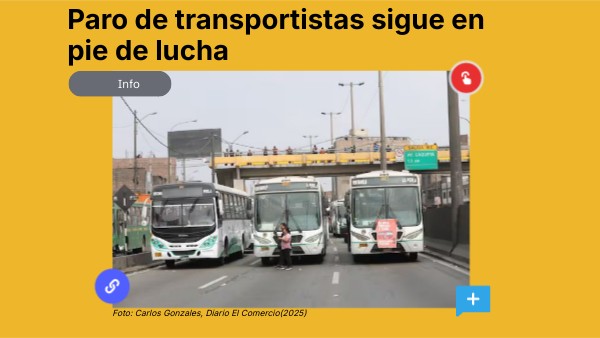 El paro de transportistas realizado este martes 4 de noviembre en Lima y Callao fue acatado por varios gremios del transporte urbano como protesta ante los asesinatos y extorsiones que vienen afectando al sector. Durante las primeras horas del día se registró una menor circulación de buses y numerosos usuarios quedaron varados en distintos paraderos. La Policía Nacional desplegó más de 3 300 agentes para mantener el orden y facilitar la movilidad, mientras que el Ministerio de Trabajo otorgó una tolerancia de dos horas a los trabajadores que tuvieron dificultades para llegar a sus centros laborales.