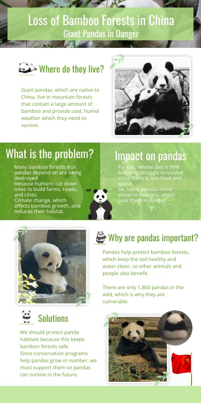 Many bamboo forests that pandas depend on are being destroyed because humans cut down trees to build farms, roads, and cities. Climate change, which affects bamboo growth, also reduces their habitat.