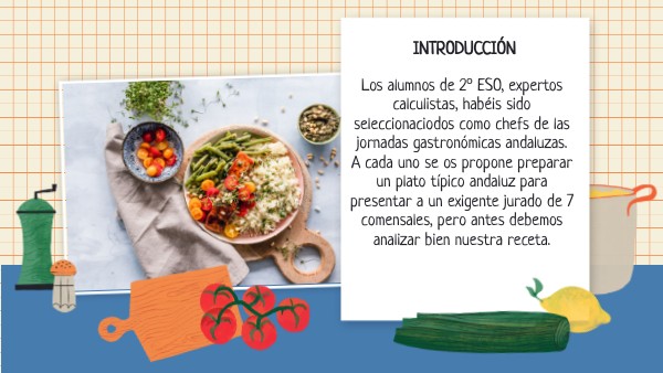 Los alumnos de 2º ESO, expertos calculistas, habéis sido seleccionaciodos como chefs de las jornadas gastronómicas andaluzas. A cada uno se os propone preparar un plato típico andaluz para presentar a un exigente jurado de 7 comensales, pero antes debemos analizar bien nuestra receta.