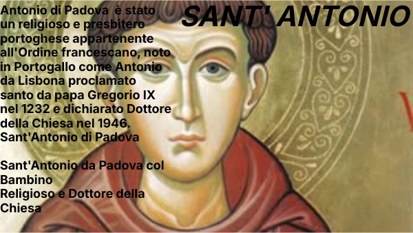 Antonio di Padova è stato un religioso e presbitero portoghese appartenente all'Ordine francescano, noto in Portogallo come Antonio da Lisbona proclamato santo da papa Gregorio IX nel 1232 e dichiarato Dottore della Chiesa nel 1946. Sant'Antonio di Padova Sant'Antonio da Padova col Bambino Religioso e Dottore della Chiesa
