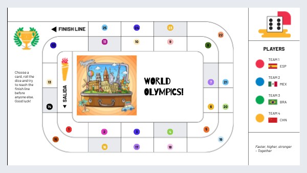 Choose a card, roll the dice and try to reach the finish line before anyone else. Good luck!