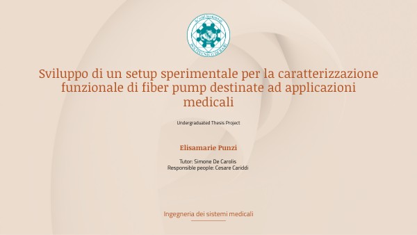 Il progetto si inserisce nelle attività di ricerca del Laboratorio di Ingegneria Meccanica del Politecnico, focalizzate sullo sviluppo di fiber pump, micro-pompe innovative destinate ad applicazioni medicali e biotecnologiche. Le fiber pump sono dispositivi miniaturizzati basati sull’impiego di tubi o fibre flessibili che, mediante deformazioni controllate o attuatori esterni, consentono il trasferimento preciso di fluidi in sistemi a scala ridotta. Rappresentano una promettente alternativa alle pompe tradizionali per applicazioni come la micro-fluidica e i dispositivi impiantabili. Il tirocinio mira alla realizzazione e caratterizzazione sperimentale di un banco di prova per la valutazione delle loro prestazioni. Il lavoro è svolto sotto la supervisione del prof. Simone De Carolis, con il supporto del ricercatore Cesare Cariddi.